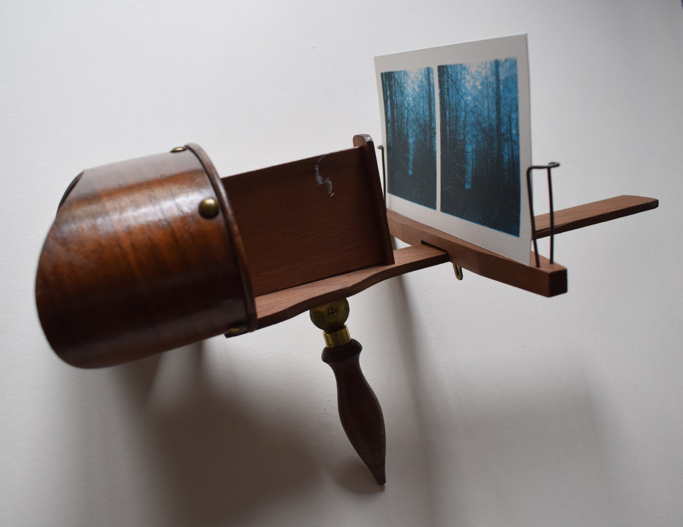 testing the landscape image through the stereoscope: not to loose sight of the stereograph framing which is a dual image with a slight shift, i cut my first print from making day and tested it in the stereograph. the stereograph is a lot clearer than i expected as i only ever remember my grandparents one being impossible to find the correct distance to focus – i am sure there is a lot of replaced parts to this ‘antique’ stereoscope that i bought on ebay and perhaps my eye sight has deteriorated since my childhood attempts which now brings the image together easier. i love the way these 2 images come together as one through this device and i love how the glass lens magnifies the print’s bitmap texture. not exactly 3d though but perhaps the image has added depth as a dual image.