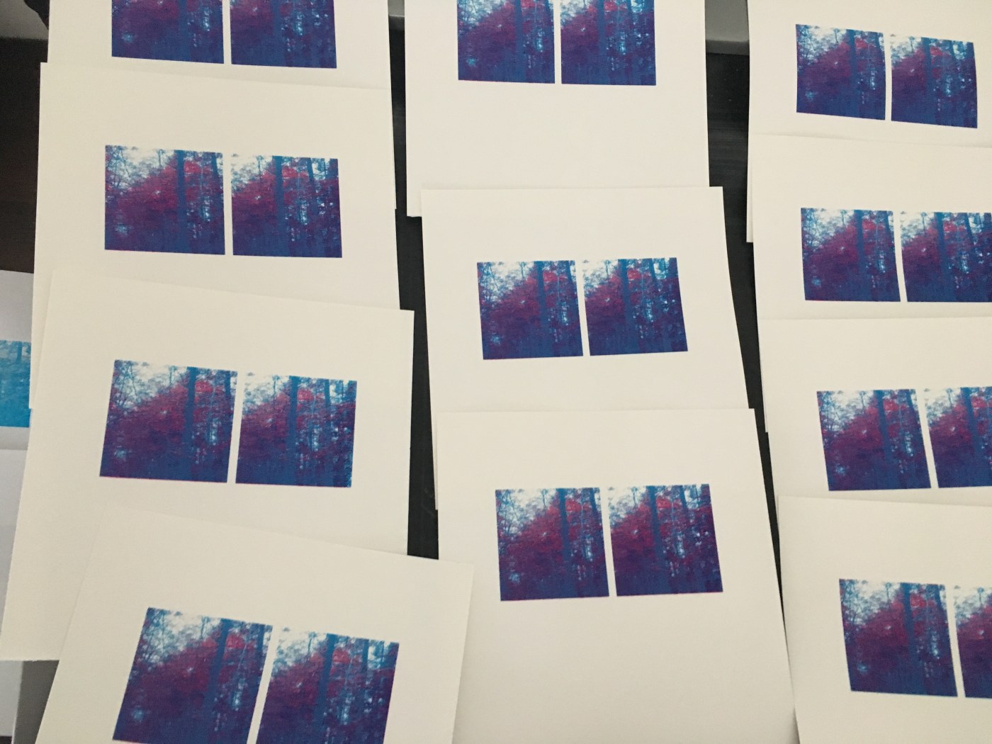 developing a series: i just spent the last few days working on 3 editions of screen prints which uses a dual image to create a single image through a stereograph – like the way the human eye uses binocular stereopsis – a slight shift in the framing from left to right. this is all part of me questioning the single fixed perspective on the landscape – historically, a gendered (and class) perspective. it also responds to my research on lens as an embodied practice which is the focus of my written paper. while i am very happy with the quality of the colour, i think that these images have become increasingly dark and have lost some of their detail so i am thinking of adding a third white over layer of detail to the images – each has roughly 12 issues so i could try it on one of each to see if it works with the image and still have an edition of 11 or 10 if it doesn’t.